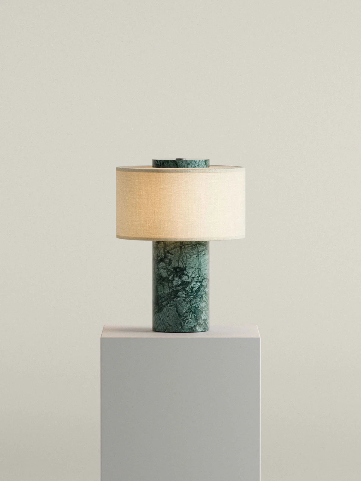 Die Aurie tragbare Tischlampe ist eine kabellose Tischleuchte für den Innenbereich. Sie besteht aus einer massiven Basis aus natürlichem Marmor (Verde Guatemala) und einem zylindrischen Lampenschirm aus cremefarbenem Leinen. Die Kombination aus Naturstein und Textil verleiht der Leuchte eine ruhige, zeitlose Optik.