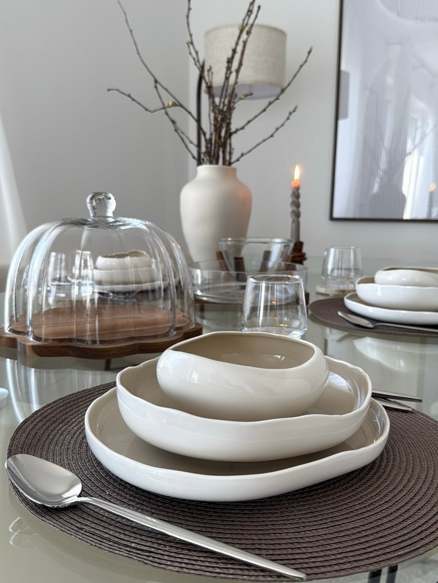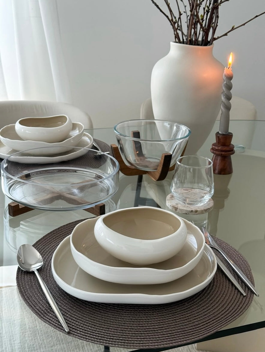 Zeitlos, harmonisch und vielseitig: Das Barles Geschirrset in Weiß–Taupe bringt moderne Eleganz auf den Esstisch. Die sanfte Zweifarbigkeit wirkt ruhig und edel und lässt sich mühelos mit verschiedenen Wohn- und Tischstilen kombinieren – ideal für den Alltag ebenso wie für besondere Anlässe.
