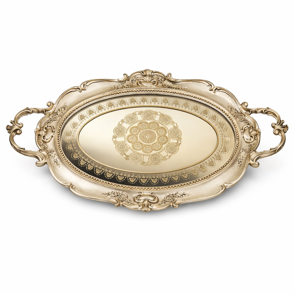 Dieses ovale Serviertablett verfügt über eine champagnergoldfarbene Oberfläche mit dekorativem Rand und einer integrierten Spiegelfläche. Es eignet sich für funktionale sowie dekorative Anwendungen im Wohnbereich.