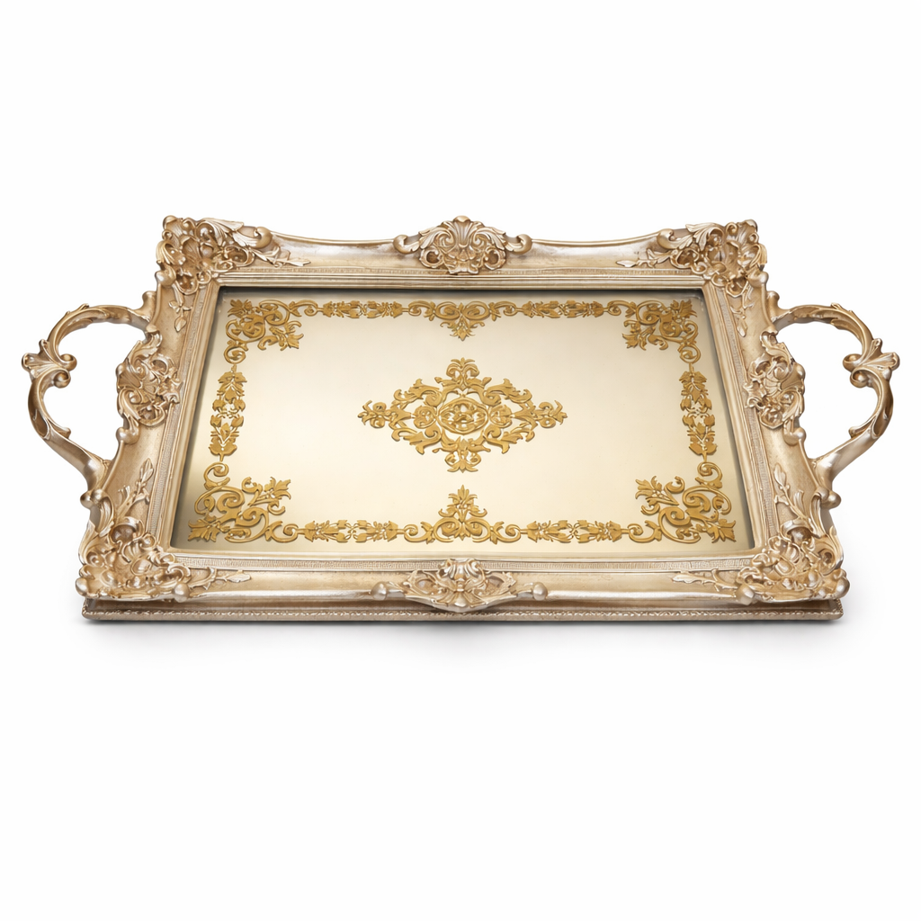 Dieses rechteckige Serviertablett verfügt über eine champagnergoldfarbene Oberfläche mit dekorativen Verzierungen, seitlichen Griffen und einer integrierten Spiegelfläche. Es eignet sich sowohl zum Servieren als auch als dekoratives Element.