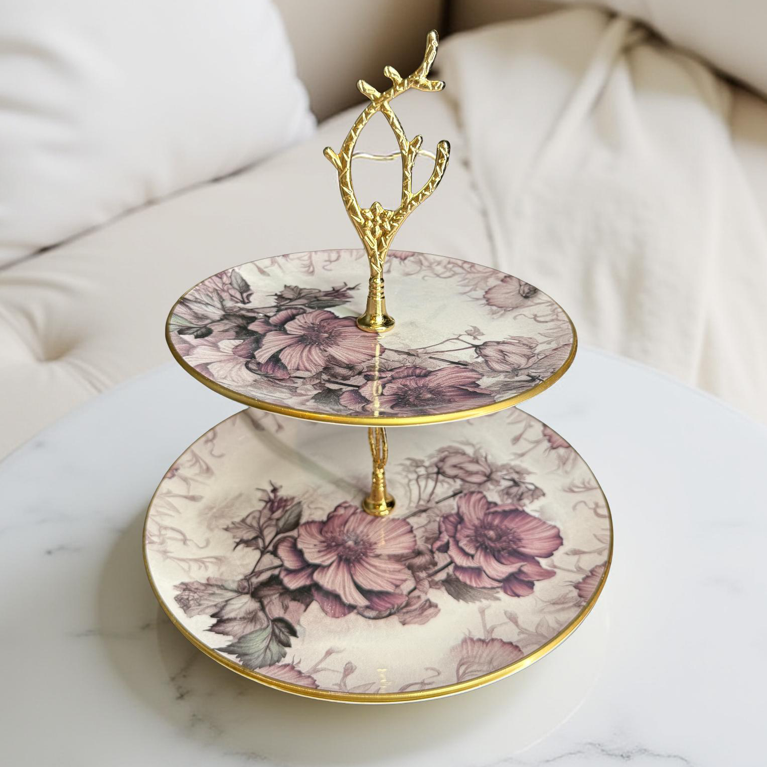 Diese zweistufige Etagere in Rosétönen mit goldfarbenem Rand eignet sich zur stilvollen Präsentation von Gebäck, Obst oder kleinen Snacks. Das dezente Farbkonzept passt sowohl zu festlichen Anlässen als auch zum täglichen Gebrauch.