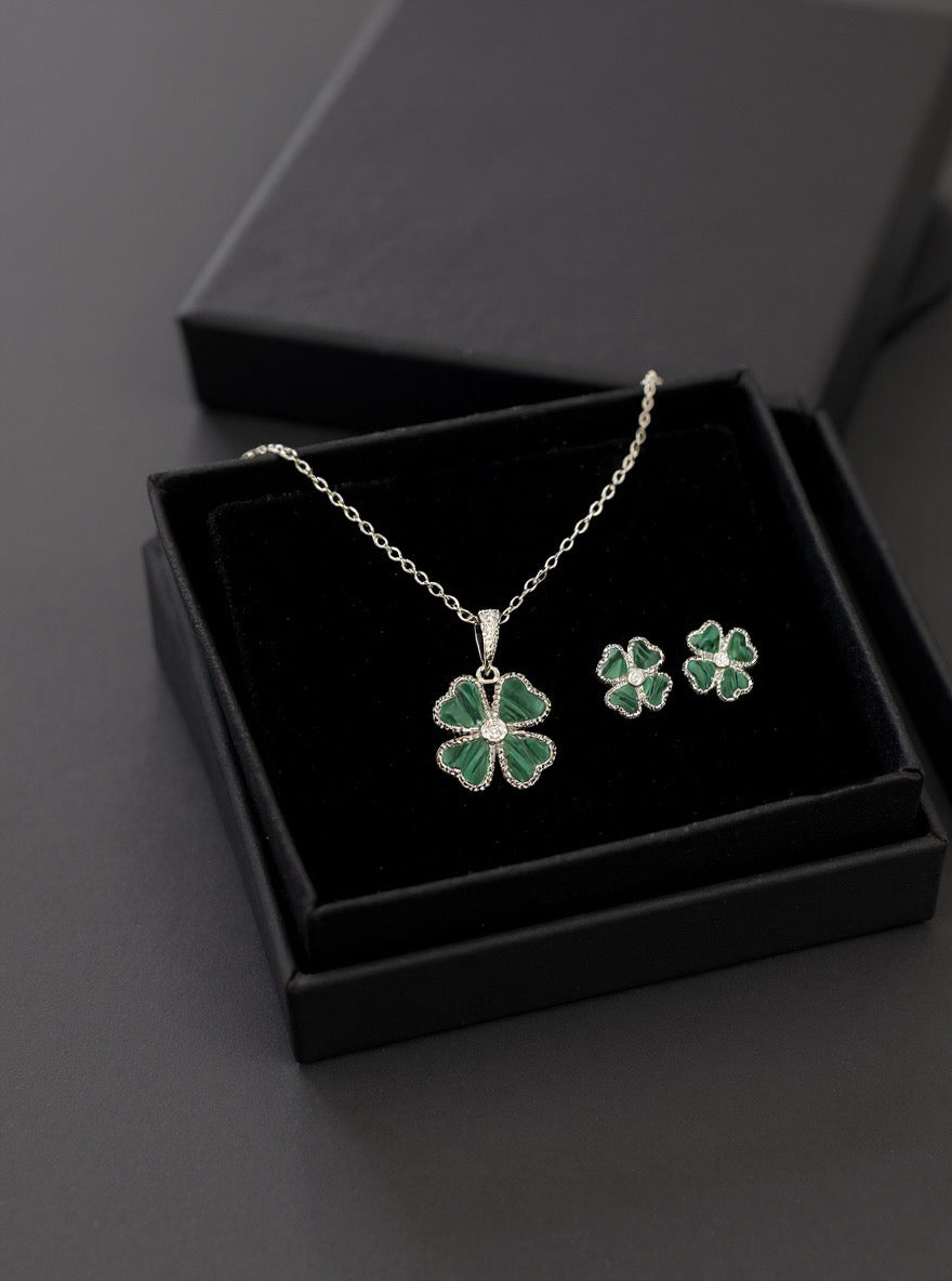 Kleeblatt-Schmuckset aus 925 Silber – Halskette & Ohrstecker (Grün)