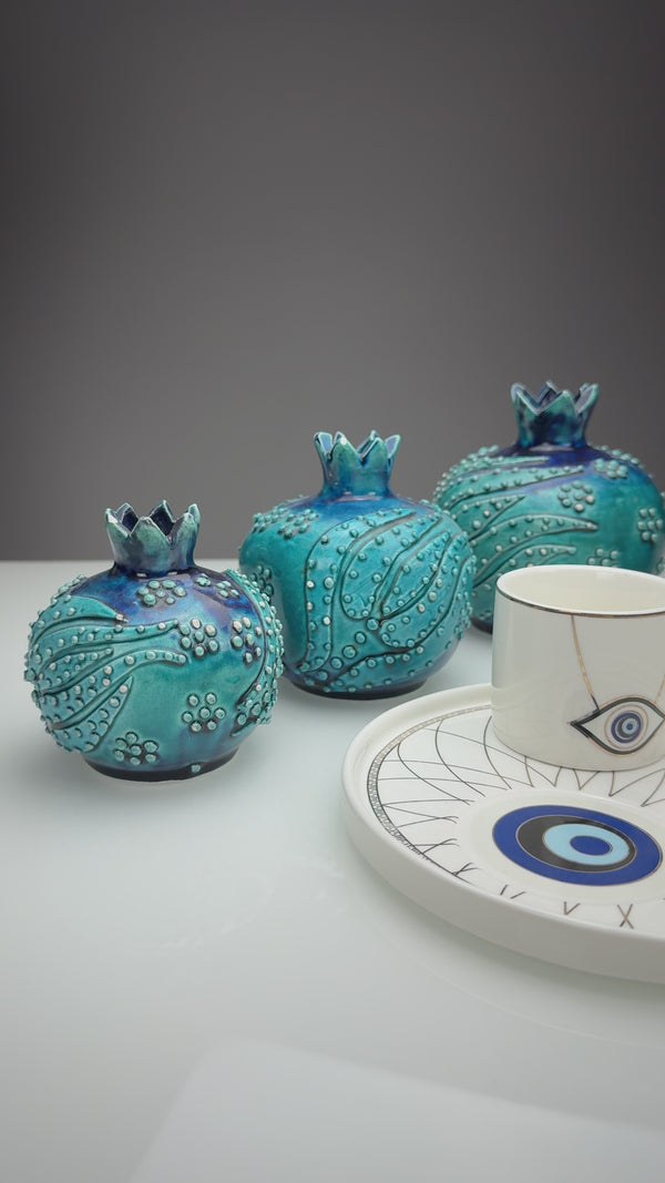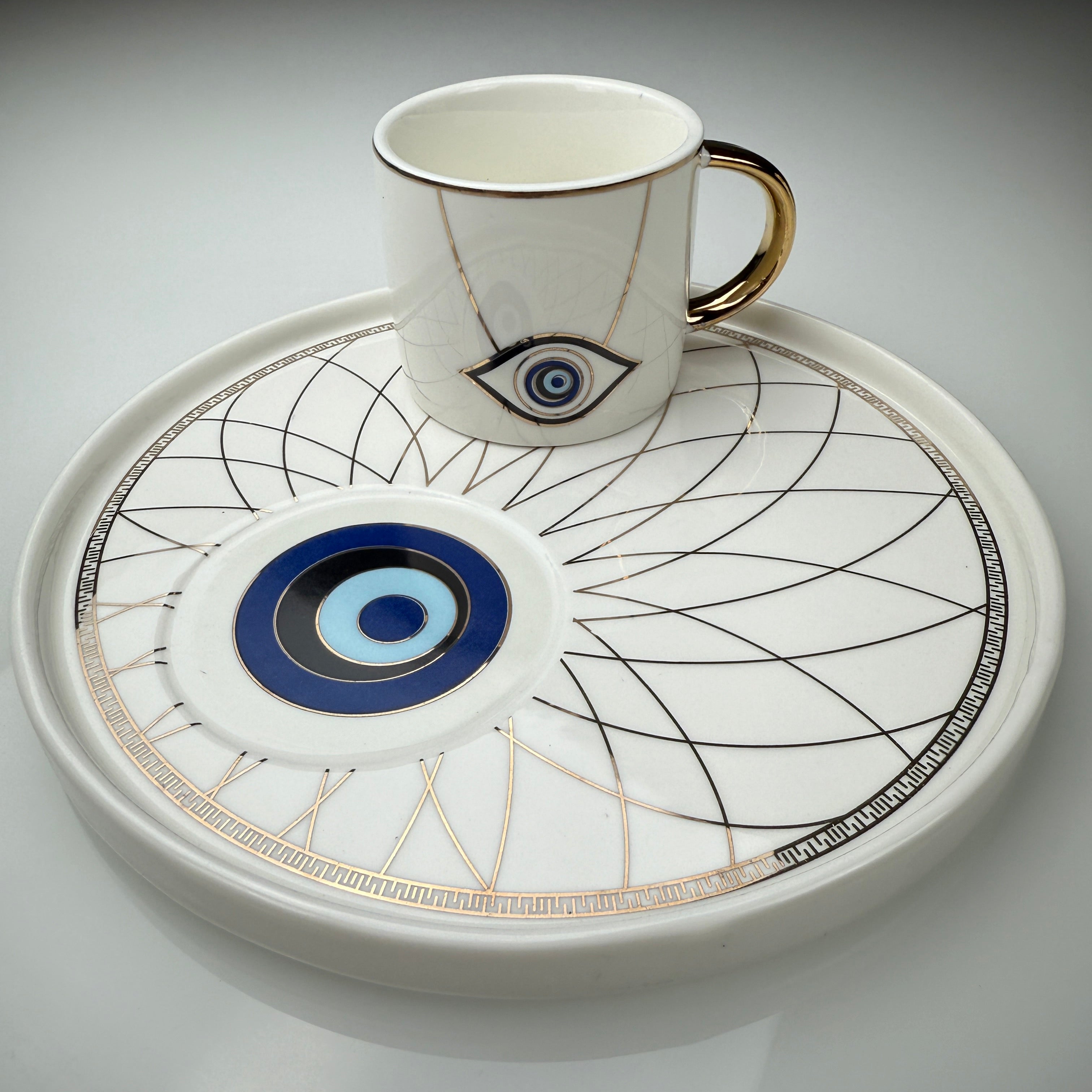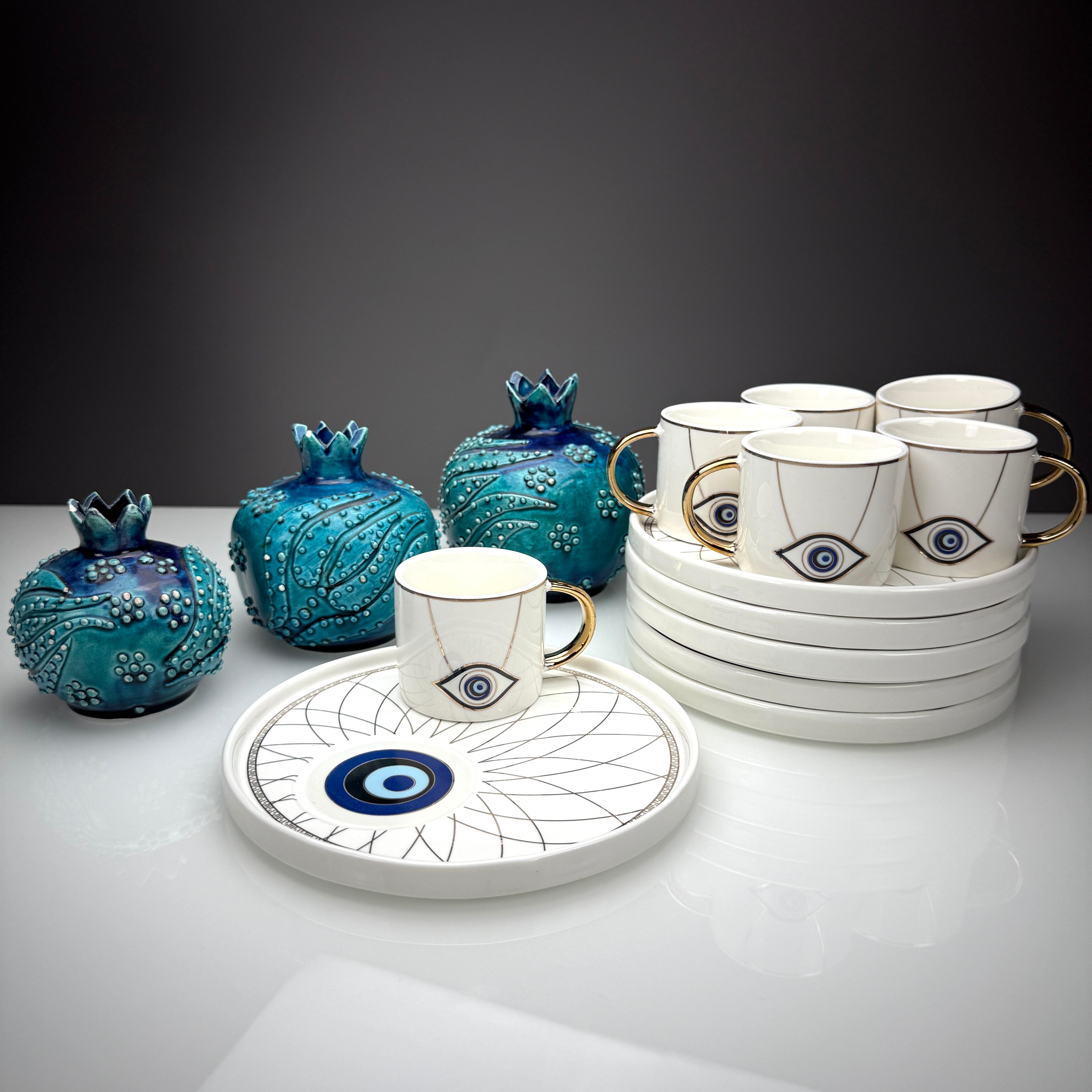 Elegantes Espresso-Set mit ikonischem Nazar-Auge: sechs feine Tassen mit goldener Kontur und Henkel sowie sechs passende Untertassen. Die Untertassen sind so gestaltet, dass sie auch als kleine Dessert-/Gebäck-Teller genutzt werden können – perfekt für Lokum, Pralinen oder kleine Küchlein.