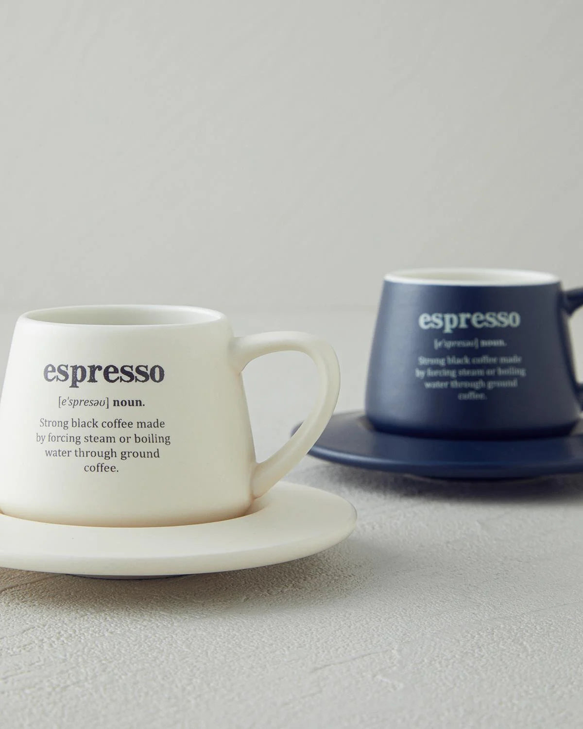 Die Tassen überzeugen durch ihr minimalistisches Design mit feiner Typografie „espresso [ɛˈsprɛsoʊ] noun.“ – ein subtiler Hingucker für Liebhaber stilvoller Details. Die glatte Oberfläche und die feine Porzellanstruktur machen das Set besonders angenehm im Gebrauch.